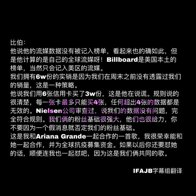 隨后,比伯發文支持A妹:“我們倆的粉絲基礎很強大,他們也很給力,你不要因為一個假消息就否定我們的粉絲基礎。這是我和A妹一起合作的一首歌,我很榮幸能和她一起合作,并為全球抗疫募集資金。如果以后你還要罵她的話,順便連我也一起懟吧,因為這是我們倆共同的歌。”