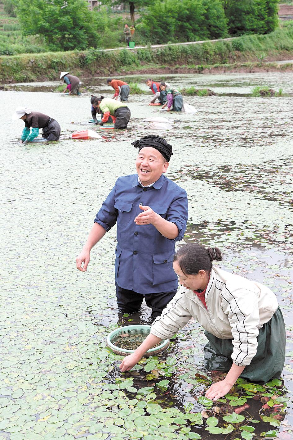 初夏,“農(nóng)民文叔”站在田里拍攝短視頻,宣傳家鄉(xiāng)利川的莼菜。 (湖北日?qǐng)?bào)全媒記者 陳勇 攝)