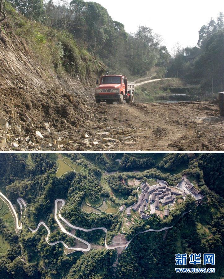 拼版照片:上圖為脫貧前的湖南省花垣縣十八洞村進村道路(2011年12月攝 新華社發);下圖為2019年9月拍攝的湖南省花垣縣十八洞村及進村道路(新華社記者陳澤國攝,無人機照片)。新華社發