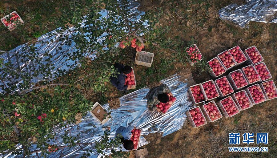 陜西省延安市志丹縣雙河鎮李家灣村村民在果園采摘蘋果(2019年10月22日攝,無人機照片)。 新華社記者 陶明 攝