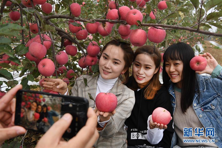 游客在陜西省延安市志丹縣雙河鎮李家灣村果園拍照留影(2019年10月22日攝)。 新華社記者 陶明 攝