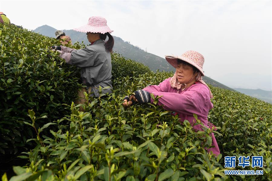 安徽金寨縣花石鄉大灣村的村民在茶產業扶貧基地里采茶(2020年4月17日攝)。 新華社記者 劉軍喜 攝