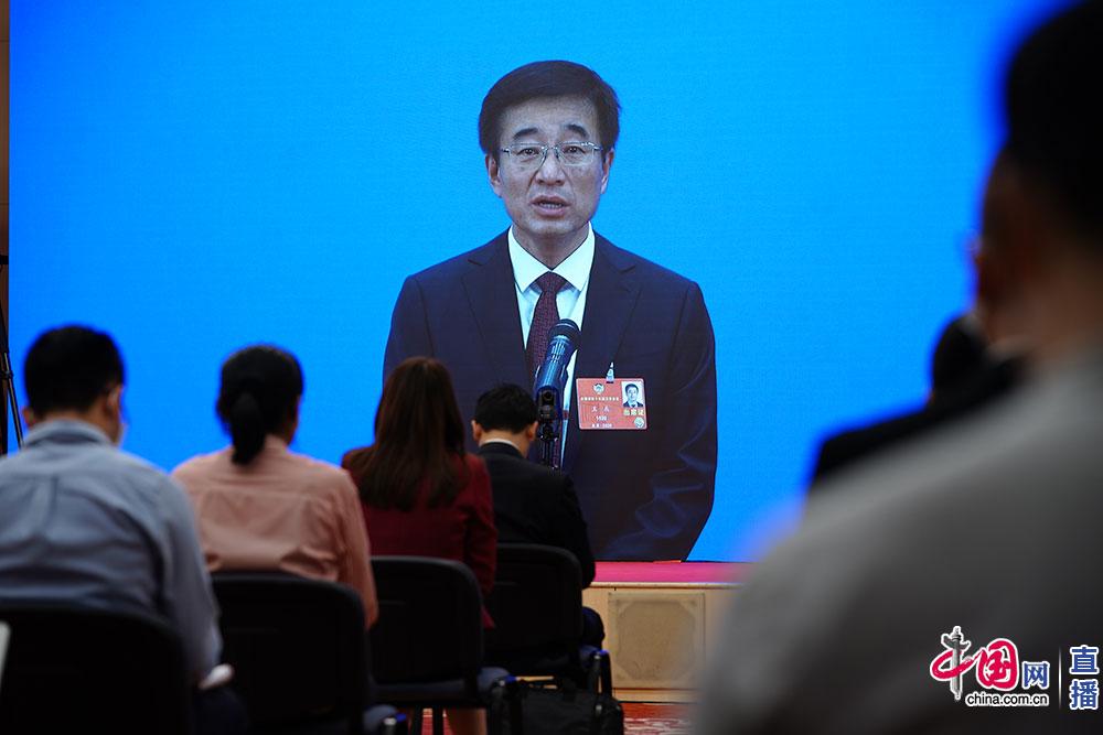 在梅地亞兩會(huì)新聞中心多功能廳分會(huì)場(chǎng),全國政協(xié)委員,中國醫(yī)學(xué)科學(xué)院和中國工程院呼吸與危重癥醫(yī)學(xué)臨床醫(yī)生王辰通過網(wǎng)絡(luò)視頻方式接受媒體采訪。中國網(wǎng) 楊佳攝影