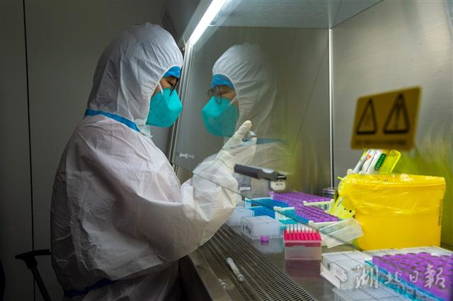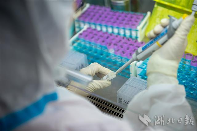 5月22日,武漢市第一醫(yī)院檢驗(yàn)科分子生物學(xué)實(shí)驗(yàn)室,檢測(cè)人員正在制備標(biāo)本。該院實(shí)驗(yàn)室是武漢市最早開展新冠核酸檢測(cè)的醫(yī)院實(shí)驗(yàn)室之一。隨著武漢市集中核酸篩查工作接近尾聲,該院核酸檢測(cè)團(tuán)隊(duì)正加班加點(diǎn)處理、檢測(cè)送檢樣本,日均檢測(cè)量超過4000份。(湖北日?qǐng)?bào)全媒記者 蔡俊 攝)