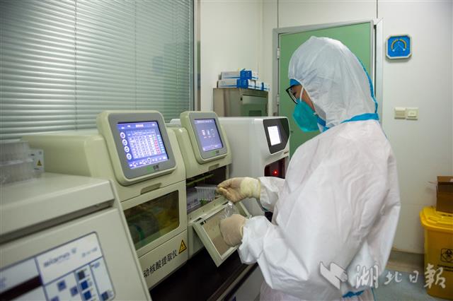5月22日,武漢市第一醫(yī)院檢驗(yàn)科分子生物學(xué)實(shí)驗(yàn)室,檢測(cè)人員使用全自動(dòng)核酸提取儀提取待檢樣本核酸RNA。