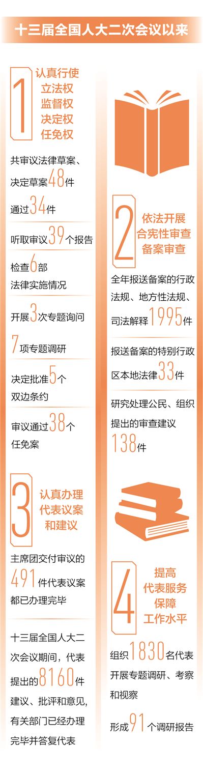 配合和促進(jìn)全面深化改革,確保改革于法有據(jù);貫徹新發(fā)展理念,以高質(zhì)量立法推進(jìn)高質(zhì)量發(fā)展;把人民對(duì)美好生活的向往作為奮斗目標(biāo),加快民生領(lǐng)域立法;圍繞國(guó)家制度和國(guó)家治理體系建設(shè),加強(qiáng)監(jiān)察、司法、社會(huì)治理、國(guó)家安全等領(lǐng)域立法……過(guò)去一年多來(lái),人大立法工作亮點(diǎn)紛呈、成效顯著。