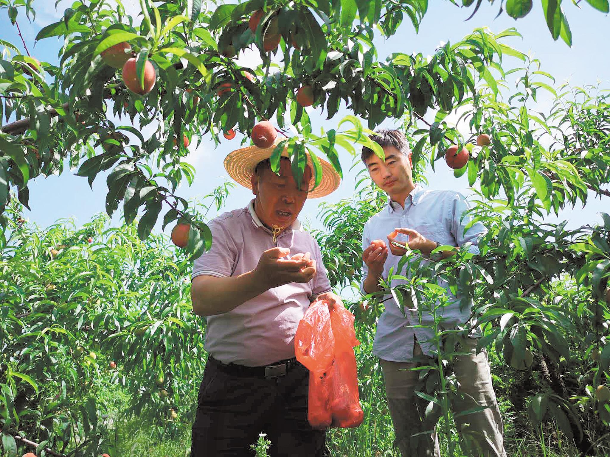 扶貧工作隊(duì)隊(duì)長(zhǎng)王黎與桃農(nóng)一起查看桃子長(zhǎng)勢(shì)。(視界網(wǎng) 唐文明 攝)