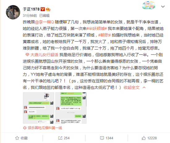 6月3日上午,繼于正第一篇“小作文”熱度持續(xù)上升后,他在微博曬出與李一桐的聊天記錄,并再次發(fā)布長(zhǎng)文并艾特李一桐,為李一桐打抱不平。于正回顧了他和李一桐合作幾部戲的經(jīng)過(guò),夸贊李一桐單純善良,還提到李一桐想回老家開(kāi)茶館。于正質(zhì)問(wèn),“一個(gè)那么善良懂得感恩的女孩,一個(gè)憑著自己努力好不容易走到今天的女孩,為什么要造謠傷害她?為什么要忽視她的努力,YY她有子虛烏有的背景,難道不能相信她就是美好的存在,這個(gè)娛樂(lè)圈總還有一片干凈的地兒吧?!”此番也疑似回應(yīng)2號(hào)晚無(wú)辜被黑的演員A指的就是李一桐。
