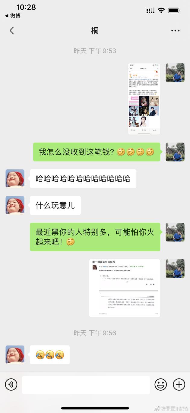 于正曬出與李一桐的聊天記錄