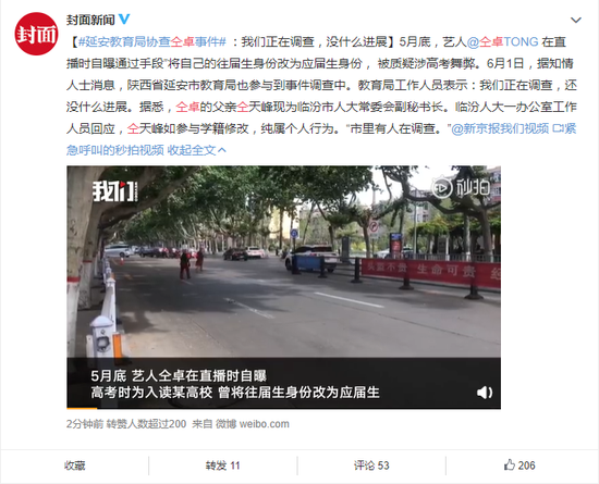 封面新聞6月3日報(bào)道 5月底,藝人仝卓在直播時(shí)自曝通過手段”將自己的往屆生身份改為應(yīng)屆生身份,被質(zhì)疑涉高考舞弊。6月1日,據(jù)知情人士消息,陜西省延安市教育局也參與到事件調(diào)查中。教育局工作人員表示:我們正在調(diào)查,還沒什么進(jìn)展。據(jù)悉,仝卓的父親仝天峰現(xiàn)為臨汾市人大常委會副秘書長。臨汾人大一辦公室工作人員回應(yīng),仝天峰如參與學(xué)籍修改,純屬個(gè)人行為,“市里有人在調(diào)查”。