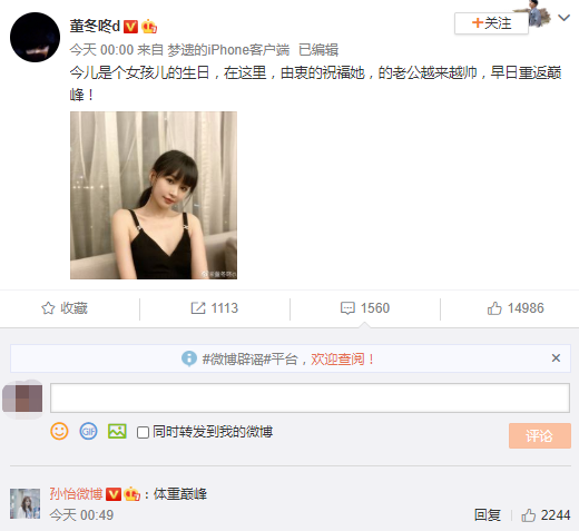 隨后,對于自己老公的生日祝福,孫怡現身評論再現互懟版狗糧,毫不留情稱祝福老公早日重返“體重巔峰”。