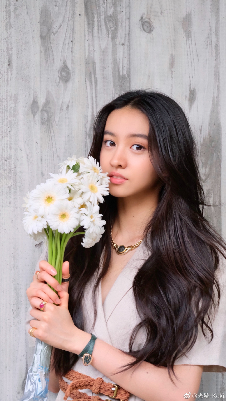 6月3日晚,木村光希曬出一組由姐姐木村心美拍攝的美照。照片中,木村光希身穿灰色V領連衣裙,一頭長卷發十分優雅。她手持一束白色菊花,遮擋住半邊臉,露出燦爛甜美的笑容。