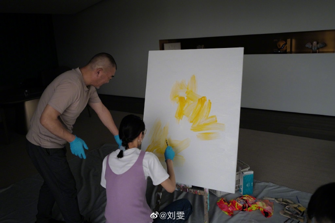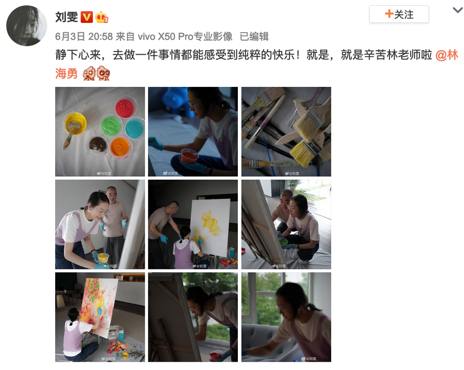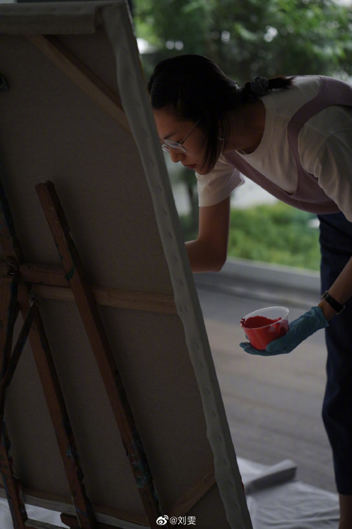 6月3日晚,劉雯分享自己畫油畫的照片,發文:“靜下心來,去做一件事情都能感受到純粹的快樂!就是辛苦林老師啦”并at藝術家林海勇表示感謝。照片中的劉雯身穿白T外搭淡紫色背心,她戴著眼鏡,將頭發隨意扎起,手拿筆刷十分認真細致地在巨大的畫布前創作著,文藝范兒十足。