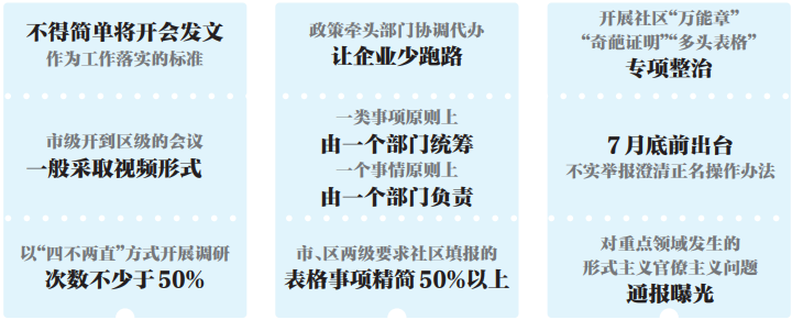 為切實(shí)減輕基層負(fù)擔(dān),《若干措施》要求, 8月底前,各區(qū)要公布新一輪的社區(qū)工作事項(xiàng)清單,防止以“屬地管理”名義將部門的工作責(zé)任壓到社區(qū),開展社區(qū)“萬能章”“奇葩證明”“多頭表格”專項(xiàng)整治,明確蓋章證明事項(xiàng)負(fù)面清單。10月底前,制定完善街道職責(zé)清單,建立落實(shí)街道職責(zé)準(zhǔn)入制度。按照權(quán)責(zé)一致原則,厘清區(qū)、街道、 社區(qū)事權(quán)關(guān)系,明確職責(zé)邊界,分清主辦協(xié)辦。