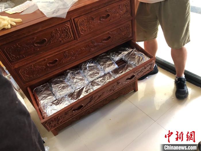 犯罪嫌疑人將毒品藏匿在紅木家具木柜抽屜內(nèi)。宜都警方 供圖