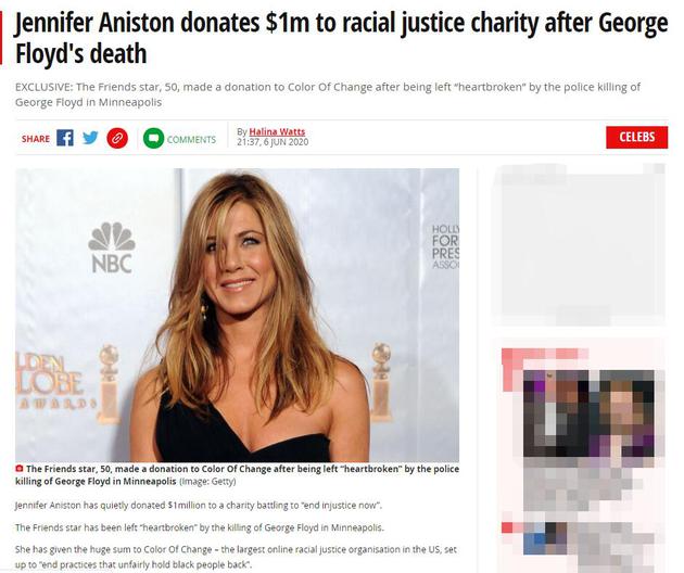 據英國《鏡報》報道,詹妮弗·安妮斯頓向美國最大的美國種族司法組織“Color Of Change”捐款了100萬美元,該組織的設立是為了“制止不公正地對待黑人的做法”。知情人士向《鏡報》透露,“像大多數人一樣,詹妮弗·安妮斯頓受到美國正在發生的事情以及有色人種每天經歷的可怕不公正的深刻影響。她想表達自己的支持,并向讓她感到最有共鳴的慈善機構捐款了一大筆錢。該鏈接位于她的Ins頁面上,因此她的粉絲也可以捐款。”