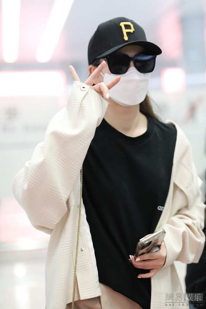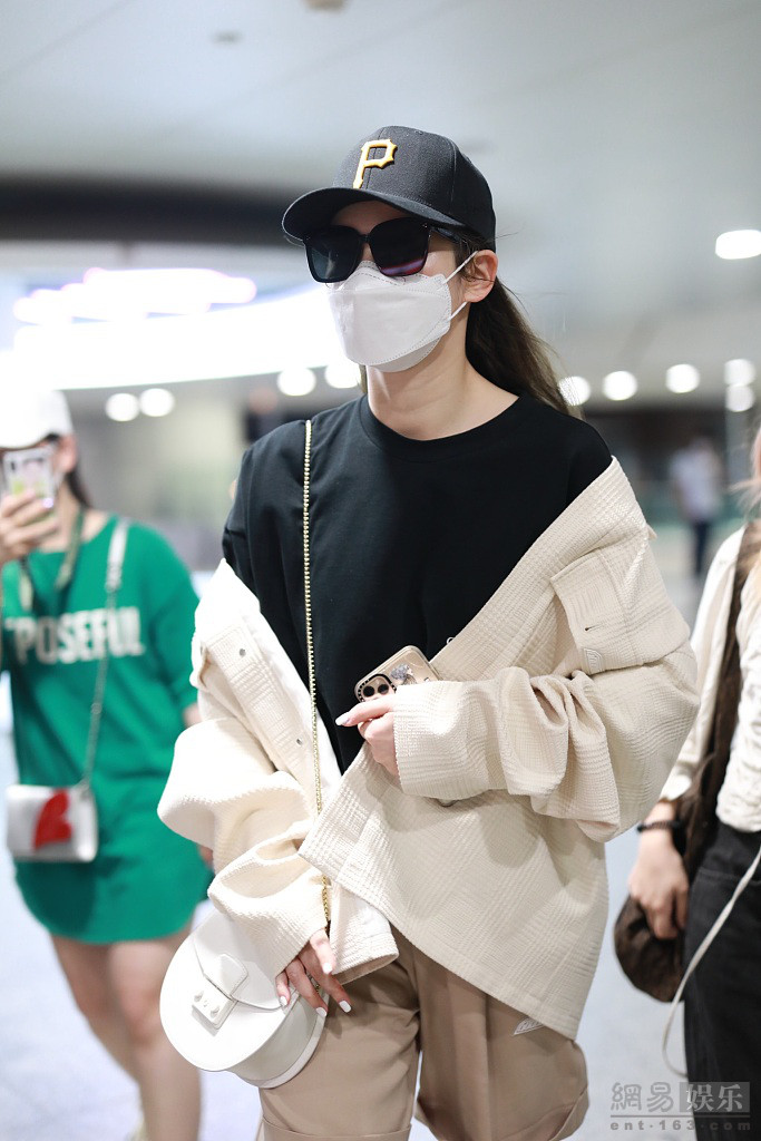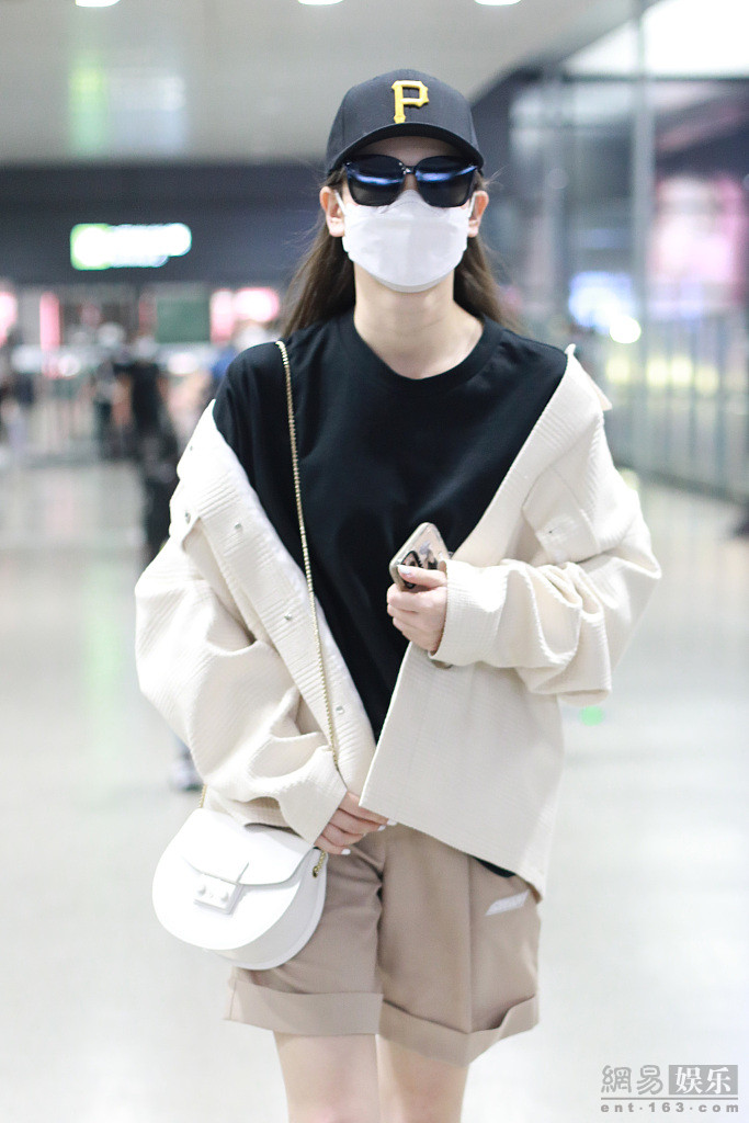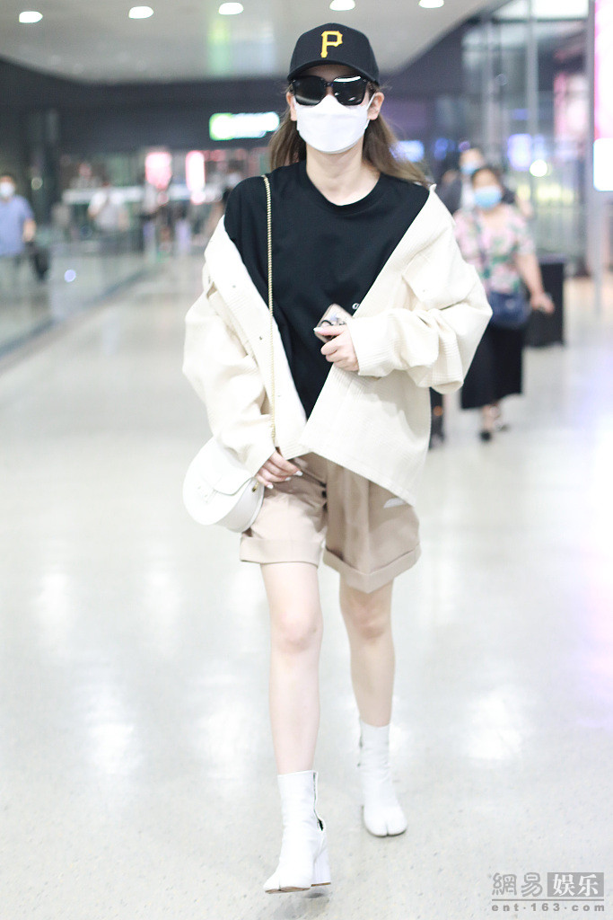 2020年6月7日,四川成都,戚薇現身機場。她身穿米色外套搭配熱褲和T恤,腳踩“腳趾靴”個性十足,邊走邊整理外套腿長兩米!