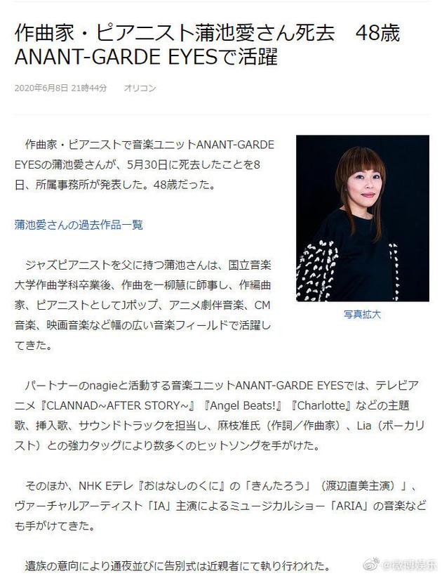 網易娛樂6月9日報道 據日媒報道,作曲家兼鋼琴家、音樂組合ANANT-GARDE EYES成員蒲池愛于5月30日去世,享年48歲。根據遺屬的意向,守夜及告別儀式由近親舉行。