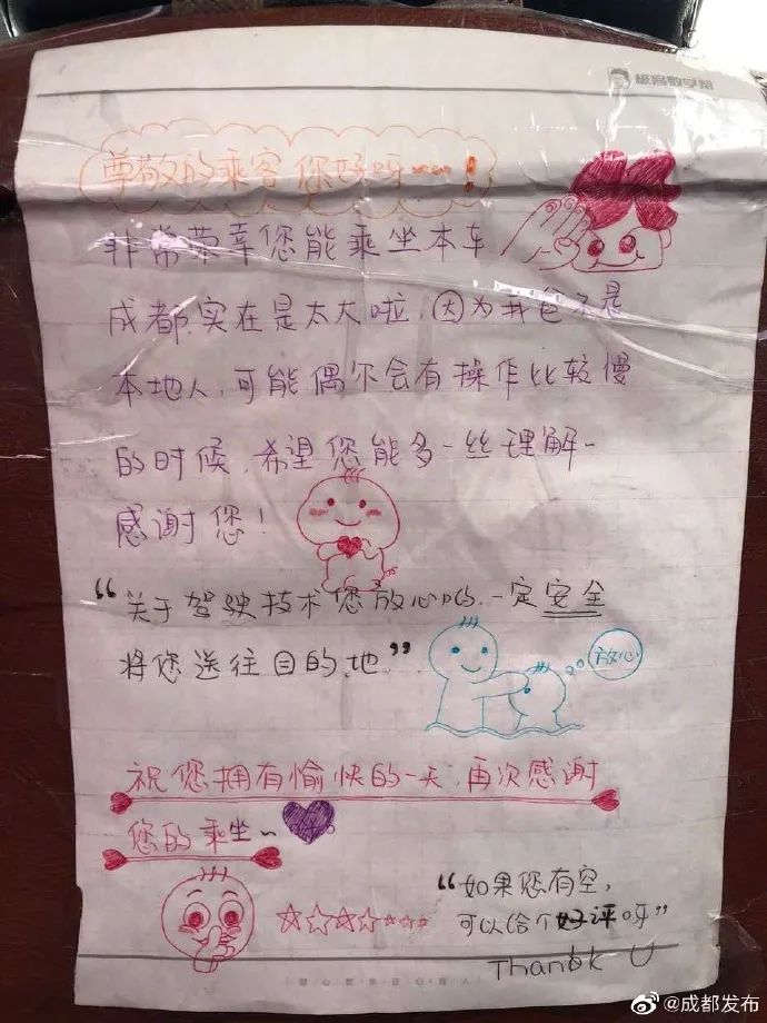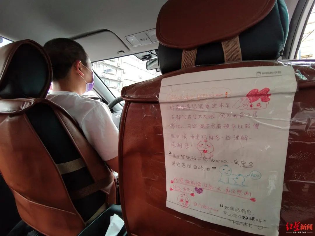 那張紙條就在副駕座后背上,用好幾排透明膠貼得嚴嚴實實。字跡看得出很稚嫩,但一筆一畫,寫得十分整齊。短短100余字,還配有4幅小插畫,用了5種顏色的筆。那4幅小插畫,分別配合著文字,畫的敬禮、比心、摸頭、點贊。