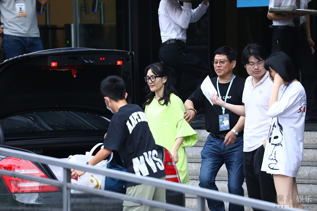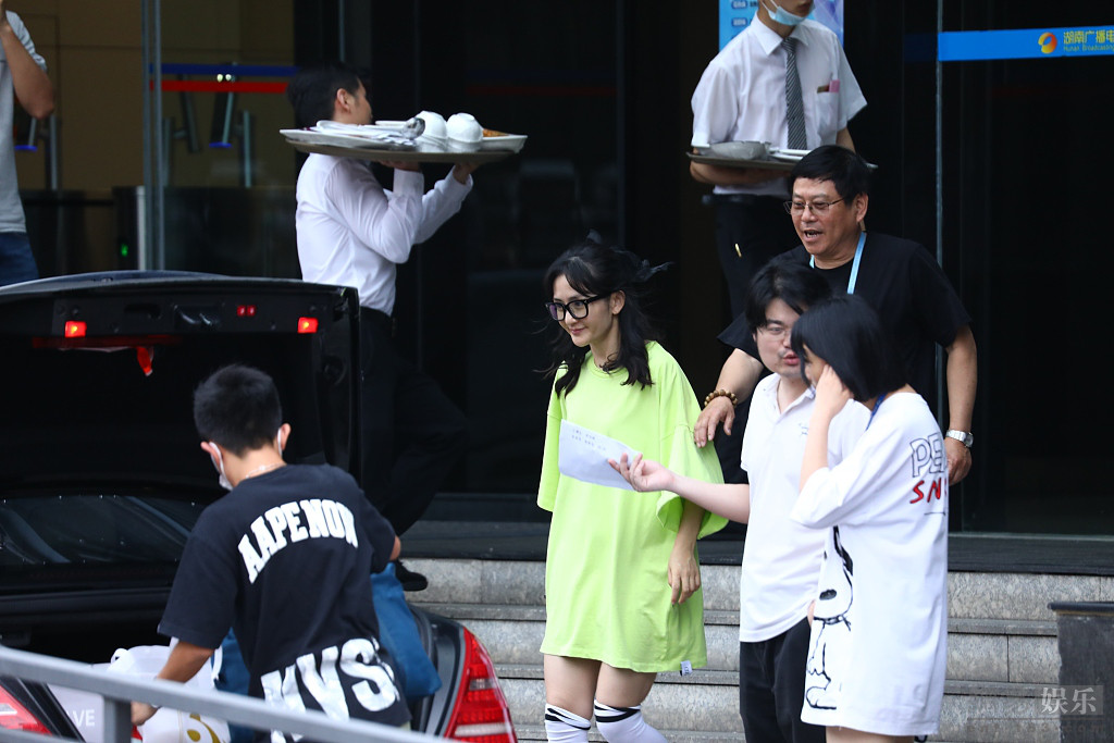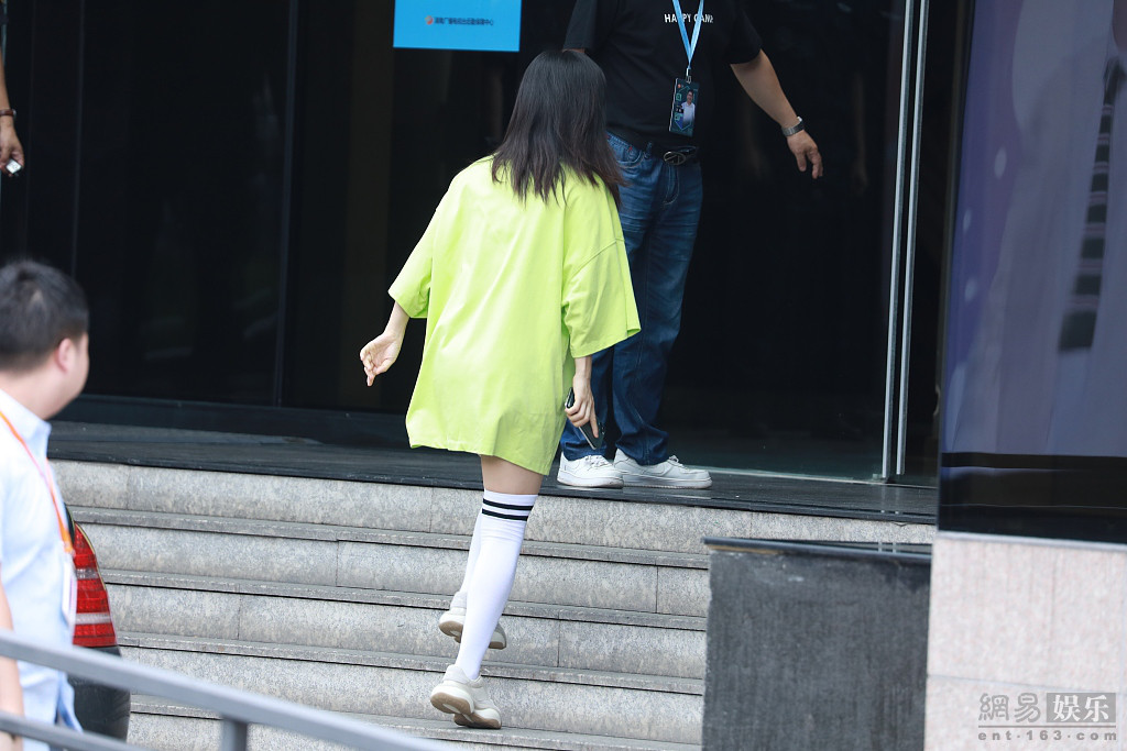 2020年6月8日,謝娜上班照曝光,她穿熒光黃色長T恤玩下衣消失,穿高筒襪秀女團腿。