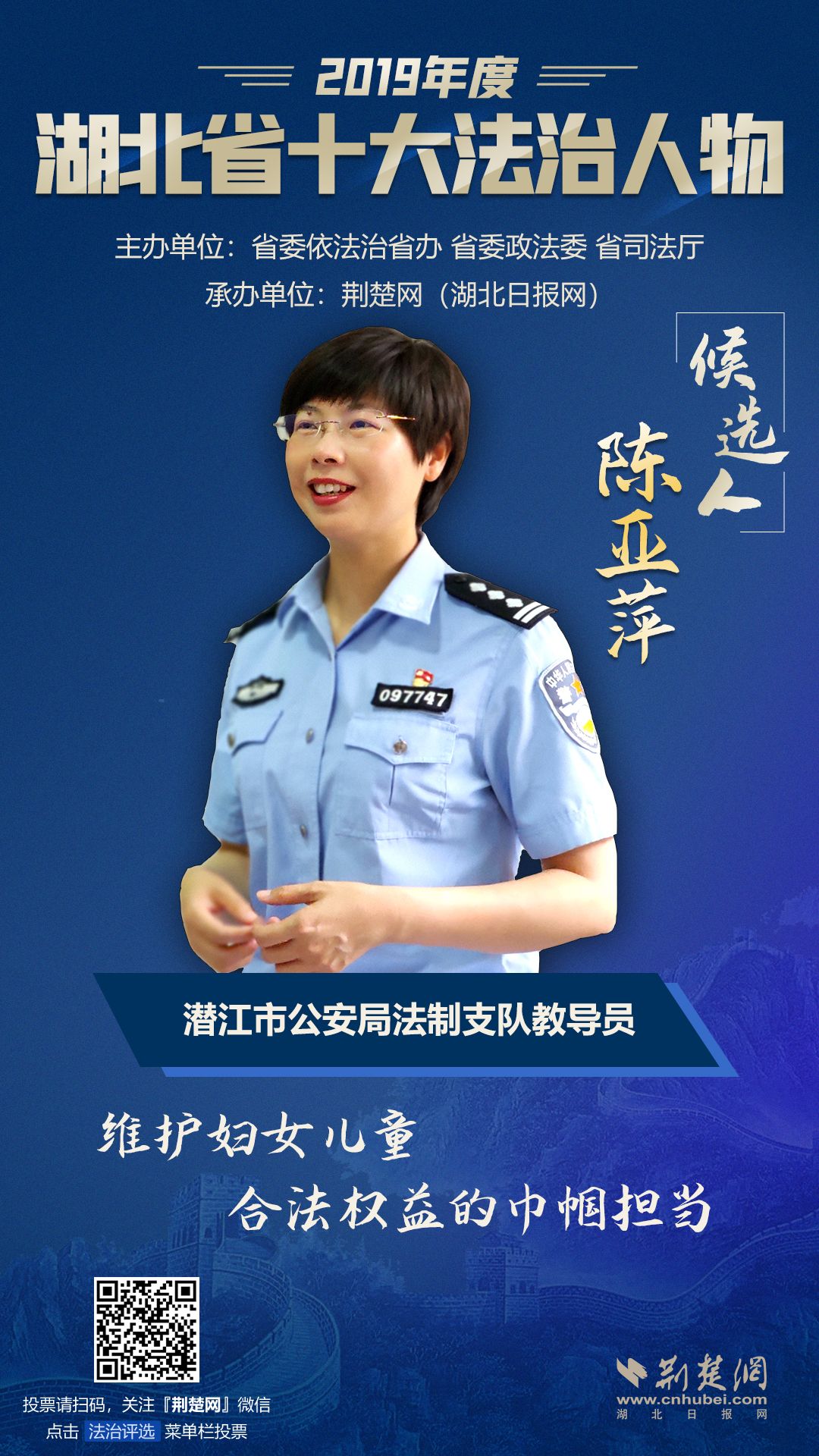 陳亞萍,女,1978年11月出生,中共黨員,現(xiàn)任潛江市公安局法制支隊教導員。