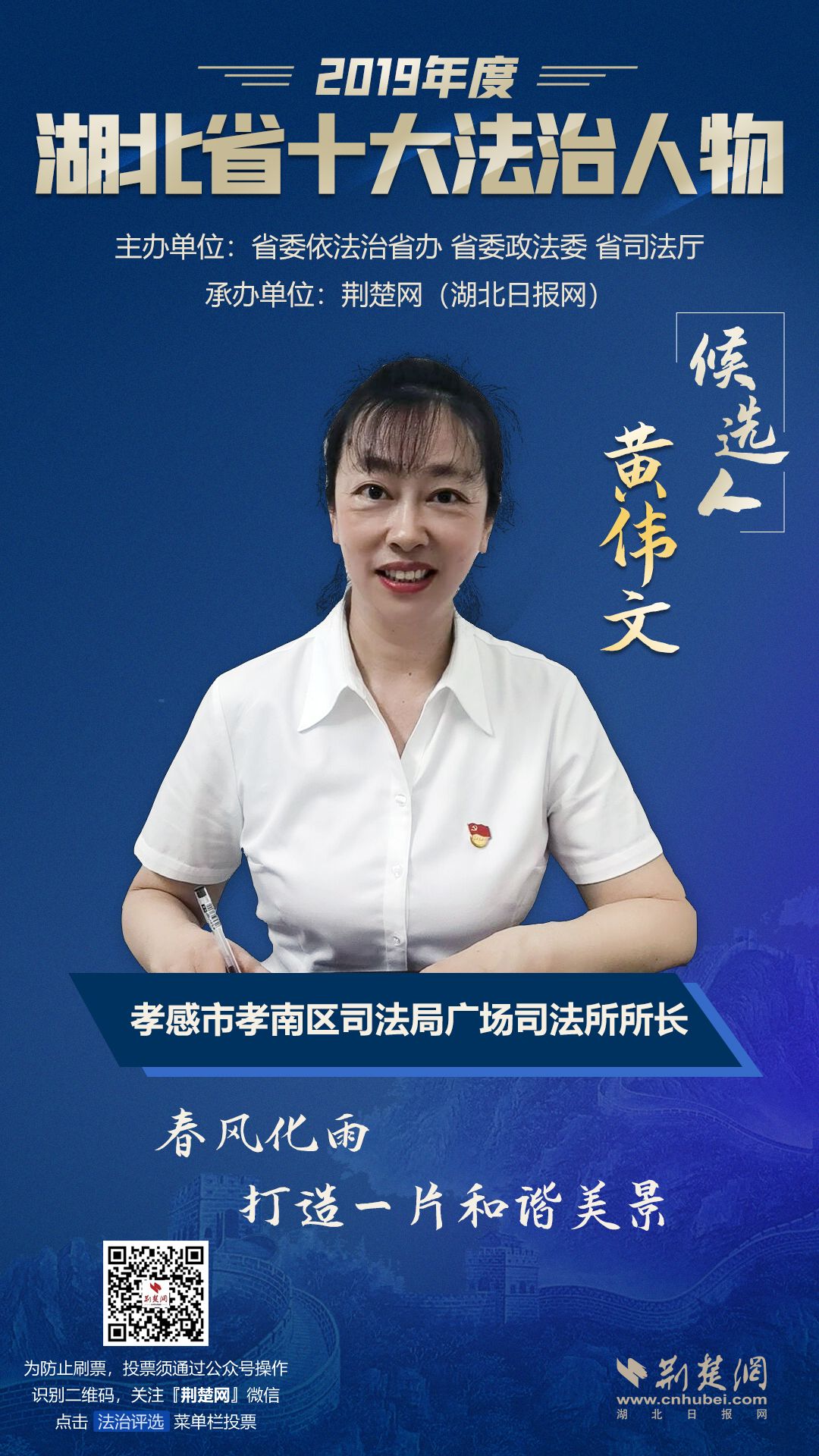黃偉文,女,1966年11月出生,中共黨員,現(xiàn)任孝感市孝南區(qū)司法局廣場司法所所長。