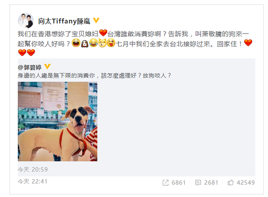 晚些時間,向太轉(zhuǎn)發(fā)了這條微博,并安慰寫道:“我們在香港想你了寶貝媳婦,臺灣誰敢消費你?告訴我,叫蕭敬騰的狗來一起幫你咬人好嗎?七月中我們?nèi)胰ヅ_北接你過來,回家住!”