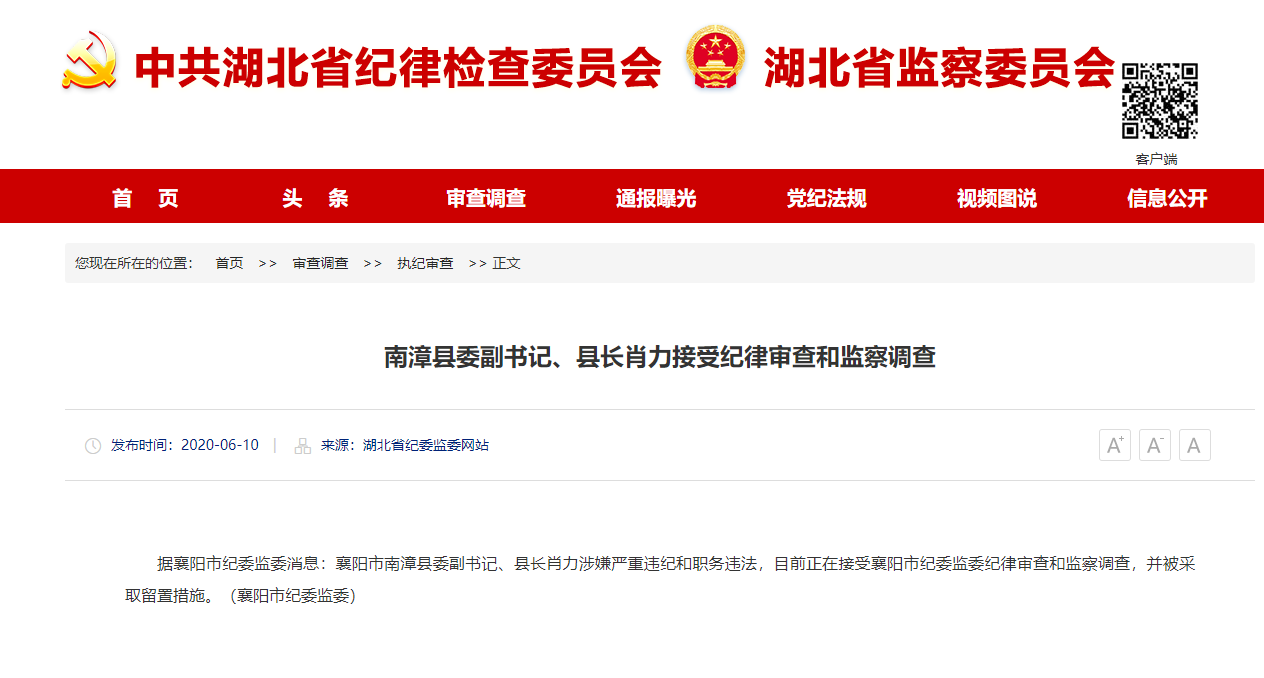 據(jù)襄陽市紀委監(jiān)委消息:襄陽市南漳縣委副書記、縣長肖力涉嫌嚴重違紀和職務違法,目前正在接受襄陽市紀委監(jiān)委紀律審查和監(jiān)察調查,并被采取留置措施。(襄陽市紀委監(jiān)委)