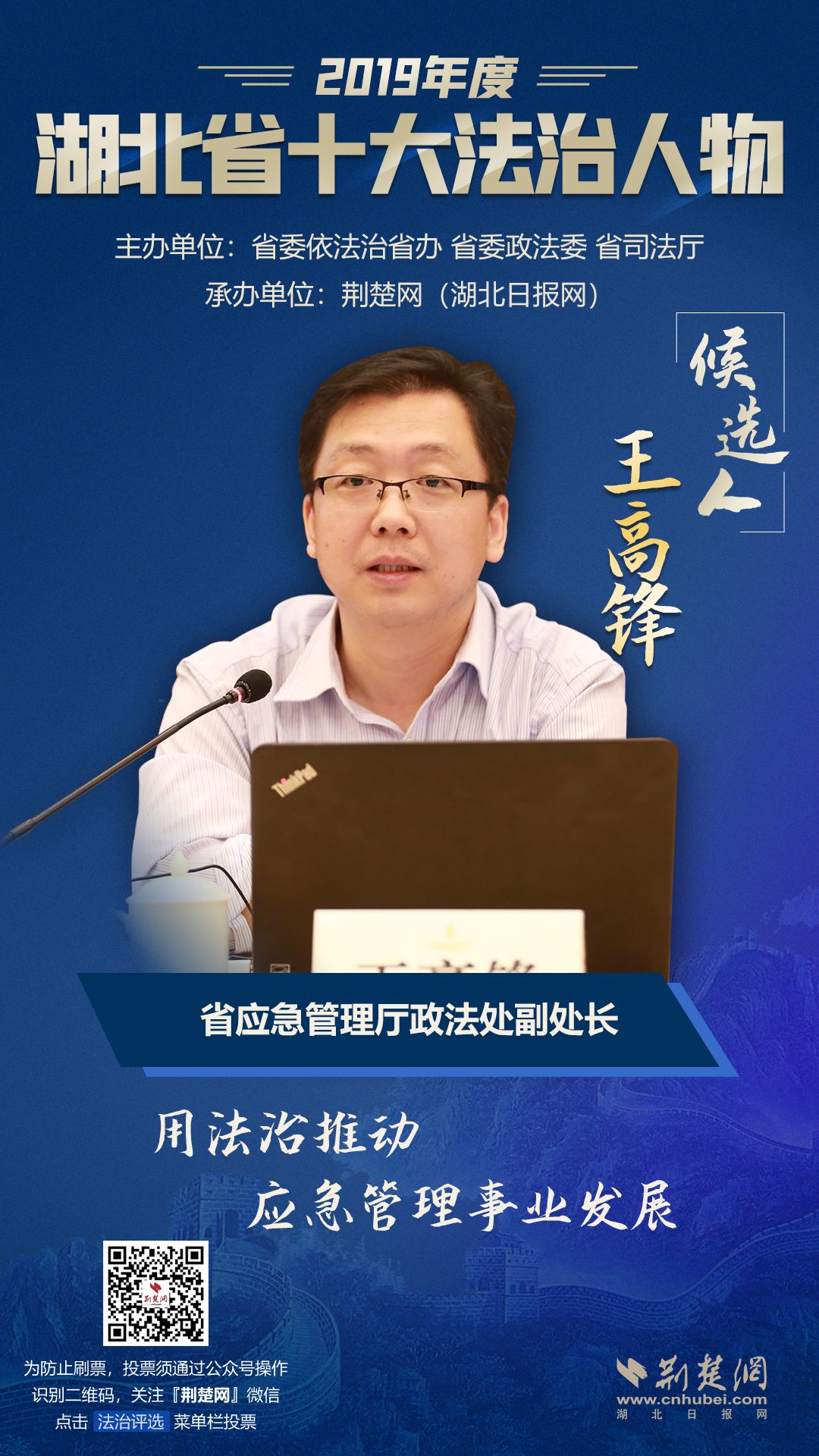 王高鋒,男,1979年1月出生,中共黨員,先后在枝江市人民法院、宜昌市政府法制辦、原湖北省安全生產監督管理局工作,現任湖北省應急管理廳政法處副處長。
