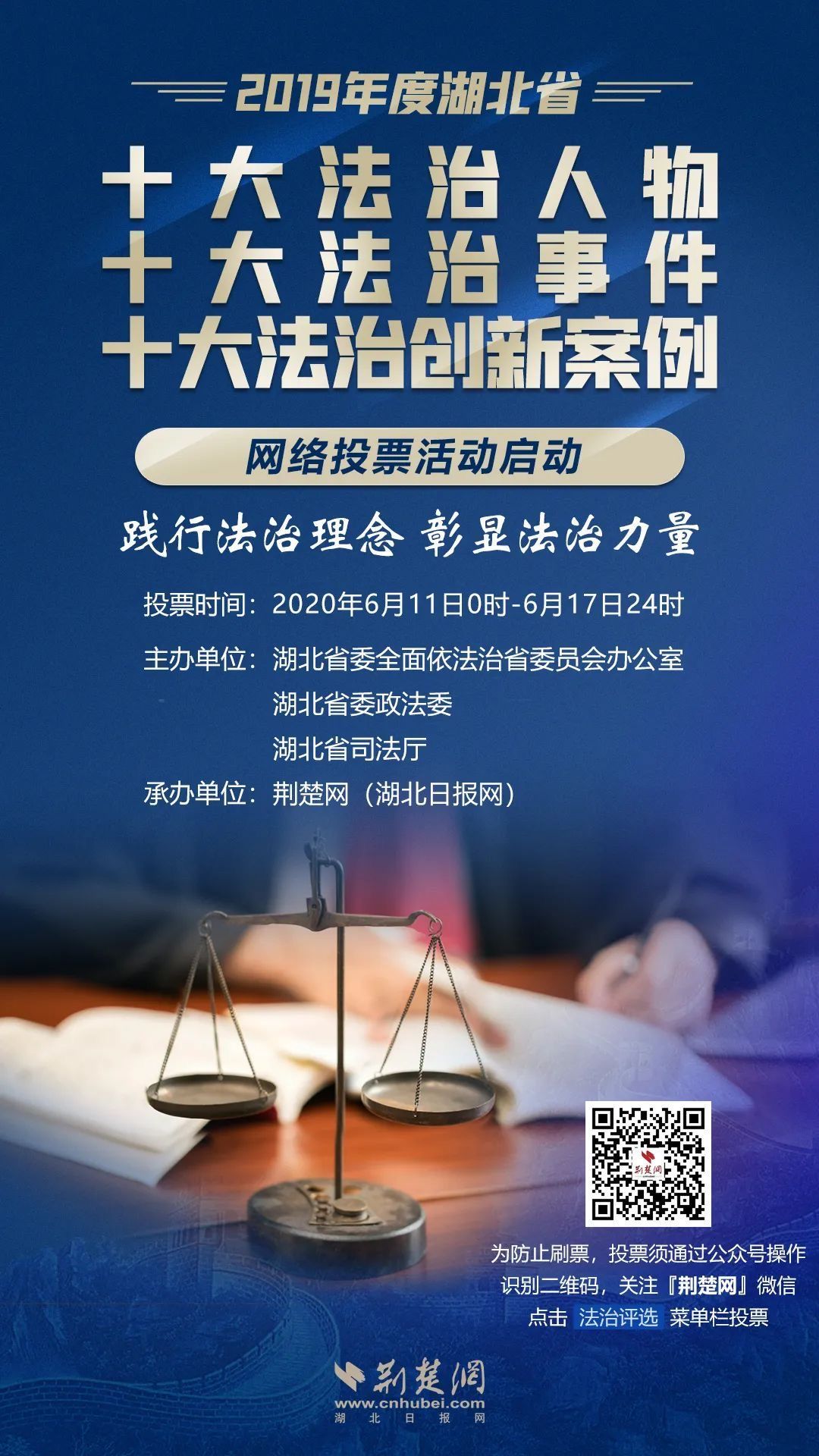 2019年度“湖北省十大法治人物 十大法治事件 十大法治創新案例”網絡投票活動的截止時間為6月17日24:00,網絡投票結果將作為評選委員會終評的重要參考,占比40%。快來參與投票,為湖北法治力量點贊吧!