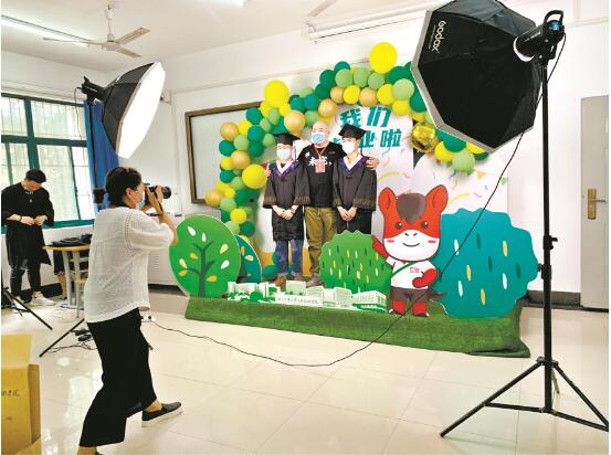 該校藝術設計系畢業(yè)手續(xù)辦理區(qū),攝影棚、手繪黑板報等布置讓返校畢業(yè)生倍感溫暖?!霸詾闆]機會擁有一張穿著學生服的照片,看到老師拿著相機和學士服等著我們,我感到特別激動?!痹撔.厴I(yè)生周詩慧說。據(jù)學校相關負責人介紹,學校在藝術設計系辦理畢業(yè)手續(xù)的教室內搭了一個攝影棚,找來學校攝影專業(yè)的授課老師,給學生提供專業(yè)的學士服拍照服務。