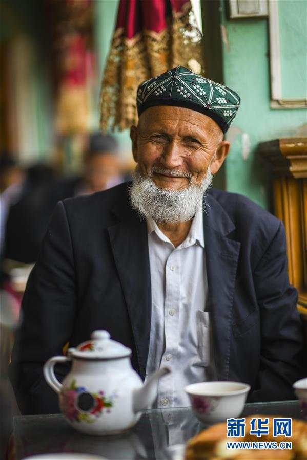 在新疆喀什老城的“百年茶館”,當地居民司馬義·達吾提正在喝茶(5月17日攝)。 新華社記者 趙戈 攝