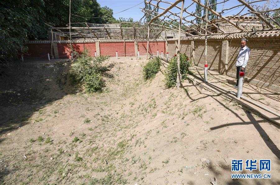 在新疆和田地區和田縣布扎克村,68歲的艾比布拉·托合提在用葫蘆接水(5月21日攝)。葫蘆是南疆鄉村常見的取水容器。 新華社記者 趙戈 攝