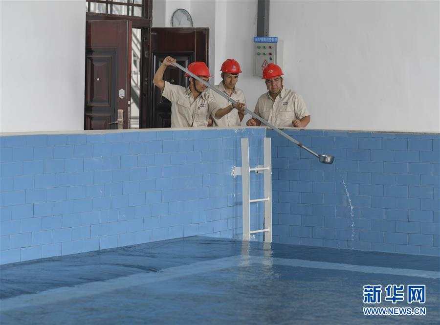 在新疆喀什地區城鄉供水總水廠里,工作人員檢查清水池工作情況(6月8日攝)。這些安全水將通過近112公里的主管道直達伽師縣,供應當地居民用水。 新華社記者 趙戈 攝