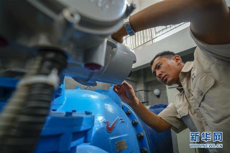 在新疆喀什地區城鄉供水總水廠里,工作人員阿卜杜薩拉木·托合提玉蘇普檢查凈化水設備(6月8日攝)。這些安全水將通過近112公里的主管道直達伽師縣,供應當地居民用水。 新華社記者 趙戈 攝
