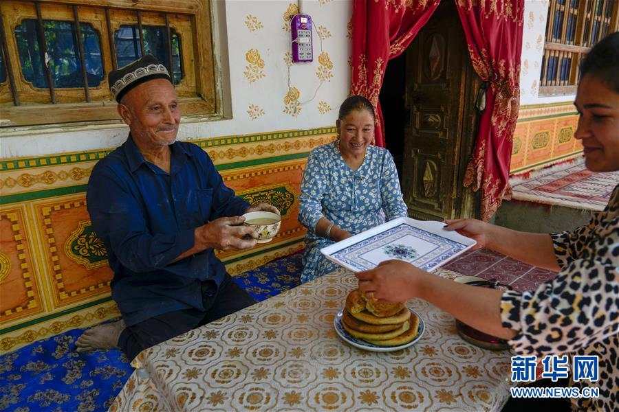 在新疆和田地區和田縣布扎克村,68歲的艾比布拉·托合提(左)與家人一起休息喝茶(5月21日攝)。新華社記者 趙戈 攝