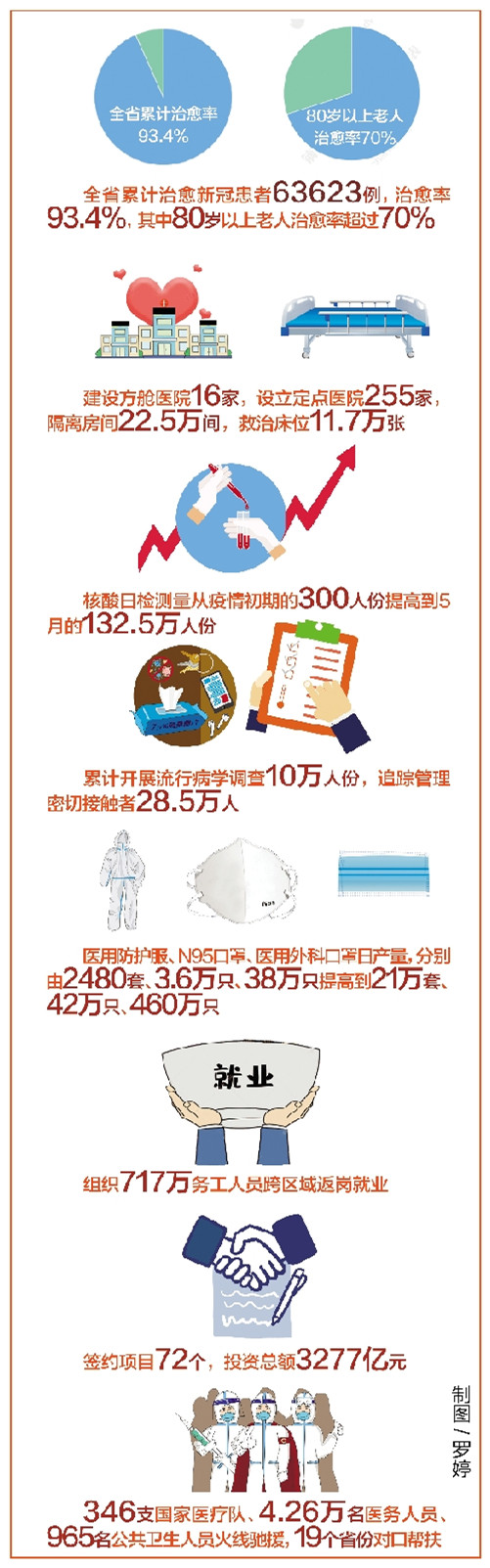 報告中,王曉東用“不惜一切代價”形容對新冠肺炎患者的救治工作:從9個月大的嬰兒到108歲的老人,全部免費救治,盡力做到不遺漏一個感染者,不放棄每一位病患;爭分奪秒建院增床,以最快速度建成火神山、雷神山醫院,建設方艙醫院16家,設立定點醫院255家、隔離房間22.5萬間、救治床位11.7萬張,實現從“一床難求”到“床等人”的根本逆轉;堅持中西醫結合,及時推廣應用多種藥物和治療方法,患者中醫藥使用率90.7%;率先確定新冠病毒全基因組序列,率先啟動滅活疫苗臨床試驗。正是這些努力,讓全省累計治愈63623例,治愈率93.4%,其中80歲以上老人治愈率超過70%。