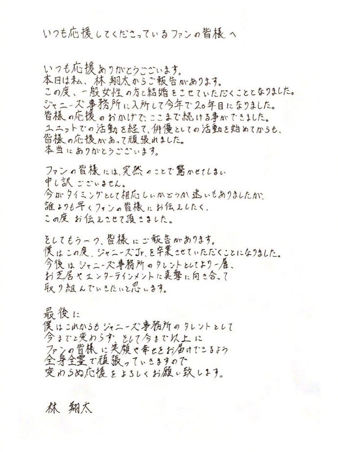 網易娛樂6月21日報道 6月20日,杰尼斯事務所宣布林翔太近日登記結婚!對方是比他大8歲的一般女性,兩人已經交往七年。林翔太在杰尼斯junior網站上親筆寫下了結婚喜訊,同時他也報告了從杰尼斯Jr.畢業的消息,今后將以J家solo藝人身份繼續活動。
