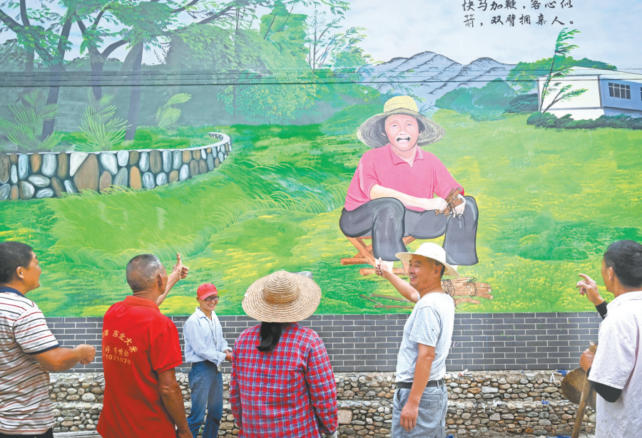 源泉村寨灣的村民邊走邊欣賞李啟安的墻畫作品。