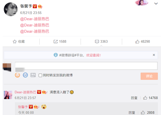 6月21日,主演的迎來大結局,張馨予發(fā)文告別角色,她寫道:“還記得戲殺青那天,我超傷心的,還記得我們寫給對方長長的信,還記得我讀了很多遍那封信,每次讀都會熱淚盈眶。特別幼稚的覺得殺青以后不能天天看見你了,失落了一段時間。秦清和周放會永遠幸福的活在她們的世界,而我們也會特別特別幸福的活在我們的世界。在我心里最可愛、努力、真實的你,值得這世界所有的愛。”還曬出了與迪麗熱巴的親密互動照,結果文案中迪麗熱巴的微博名字卻@錯了,隨后,張馨予連續(xù)@了三遍迪麗熱巴正確的微博名字,而熱巴也在評論中回應:“滿意滴入睡了”