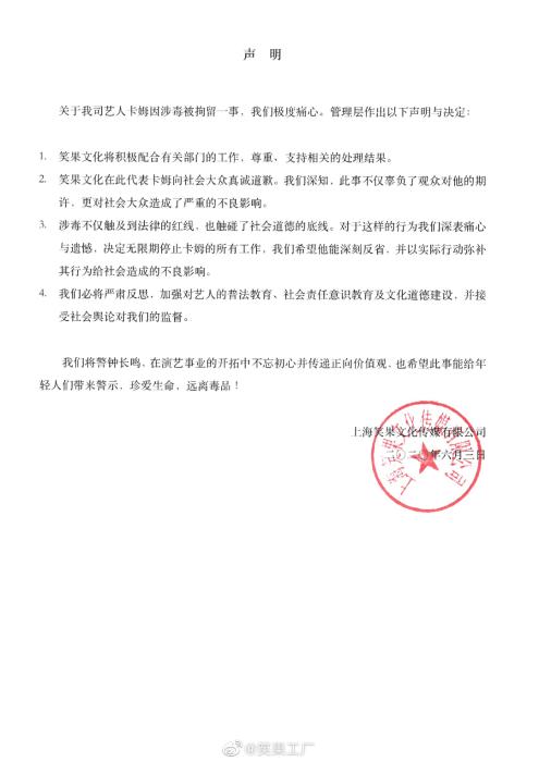 當(dāng)日,笑果文化就此發(fā)布聲明稱,對于卡姆因涉毒被拘留一事,“我們極度痛心”。