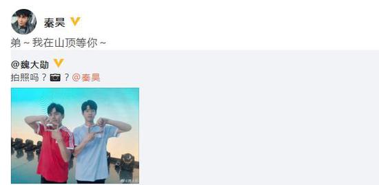 照片中,兩人親密站并肩而戰,一起用手擺出拍照的手勢,十分酷帥。稍后,秦昊轉發并借用近日自己的熱播網劇《隱秘的角落》中的梗回應互動稱:“弟,我在山頂等你!”