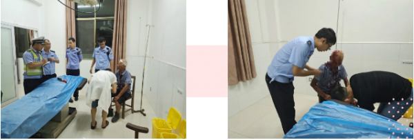 事情還要從當晚說起。6月14日21時,青原區渼陂派出所民警胡旭、何書承,輔警肖賀明駕駛警車巡邏至省道S319與縣道交叉路口時,發現一位老人瑟瑟發抖地斜靠在馬路邊上的一棵樹上,全身上下血跡斑斑,樣子十分嚇人。民警急忙停車向老人了解情況。