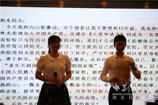 “不忘初心、薪火相傳”環節,百瑞景社區書記王涯玲現場誦讀并贈予一封信給自己“傳幫帶”的入黨積極分子學員,此舉代表著老黨員對年輕一代的殷殷囑托,象征著共產黨人革命精神的傳遞和延續。