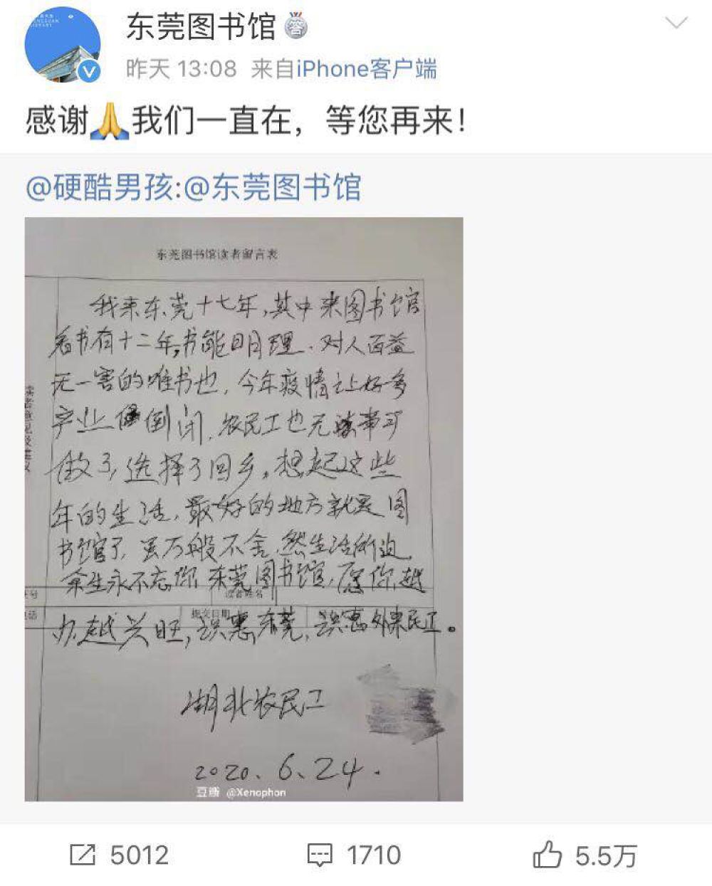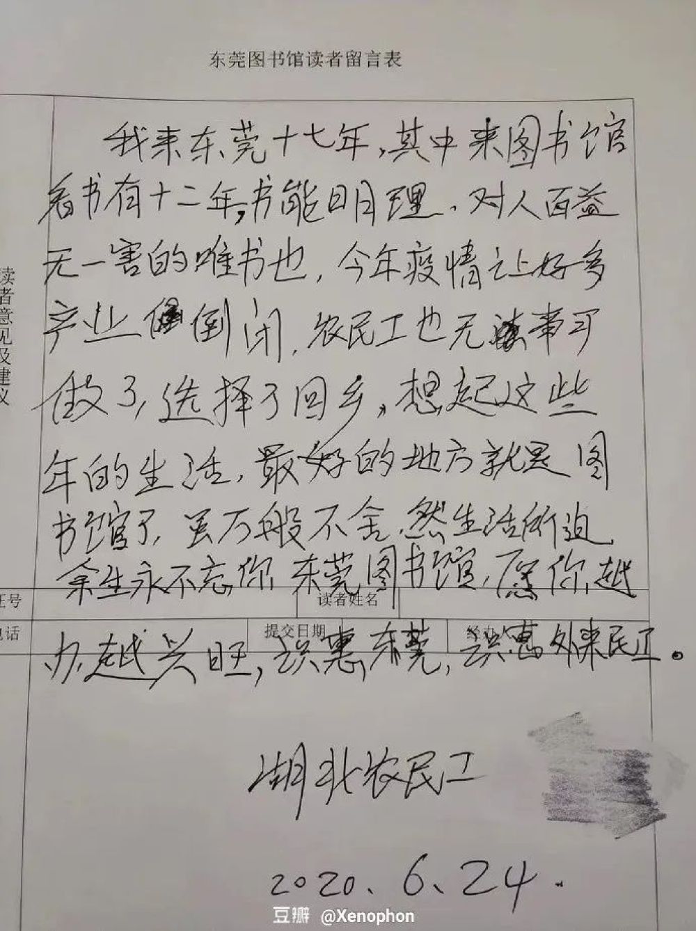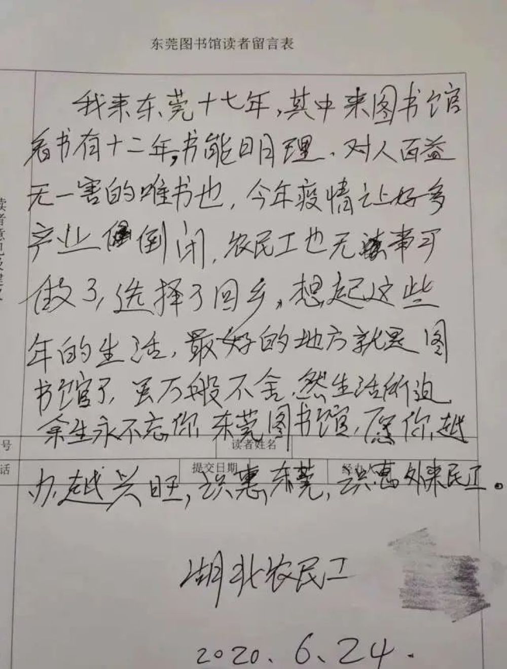 “我來東莞十七年,其中來圖書館看書有十二年。書能明理,對人百益無一害的唯書也。今年疫情讓好多產業(企業)倒閉,農民工也無事可做了,選擇了回鄉。想起這些年的生活,最好的地方就是圖書館了。雖萬般不舍,然生活所迫,余生永不忘你,東莞圖書館,愿你越辦越興旺。識惠東莞,識惠外來農民工?!?