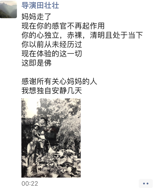 田壯壯導演在朋友圈寫道:媽媽走了,現在你的感官不再起作用,你的心獨立,赤裸,清明且處于當下,你以前從未經歷過,現在經歷的一切,這即是佛。