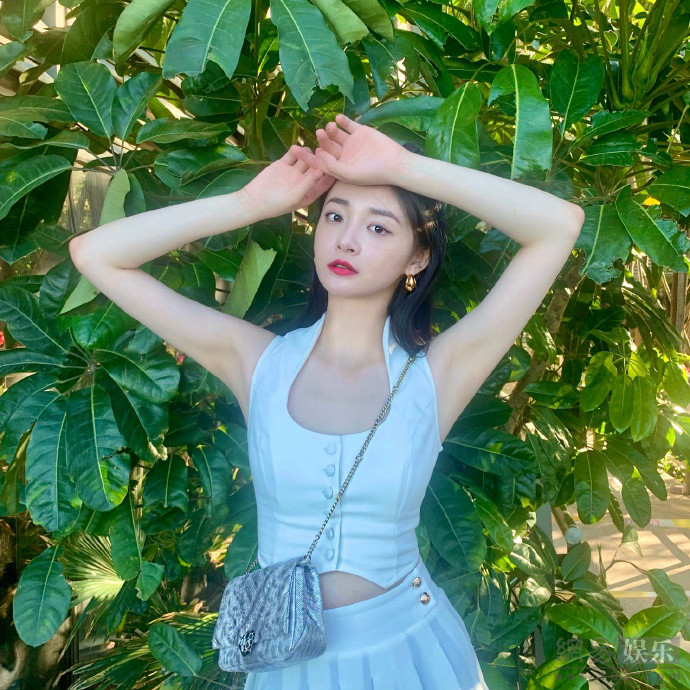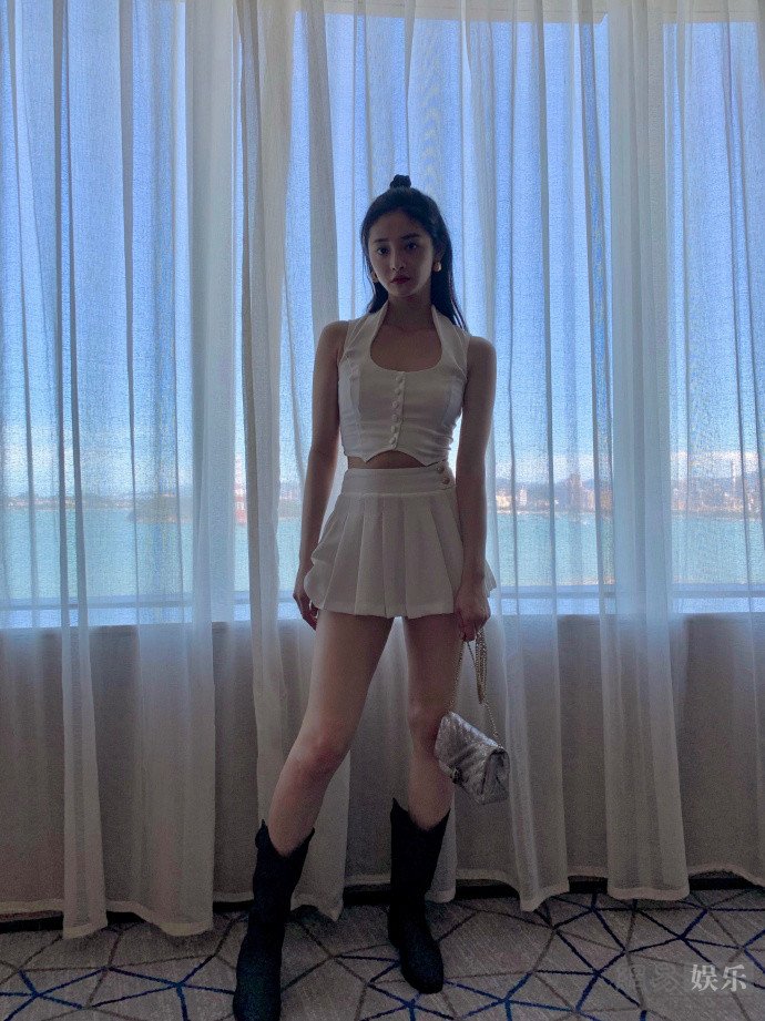 6月28日,周潔瓊在社交平臺上曬出一組照片,她穿著清涼的白色套裝秀出好身材,給影子照p上:“今日長腿MM!“十分可愛逗趣。
