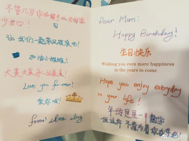 只見卡片中馬伊琍女兒認真寫道:“不管幾歲你依然可以活的像少女,讓我們一起乘風破浪吧!加油小姐姐!大美大美永遠最美!親愛的媽媽,生日快樂!”