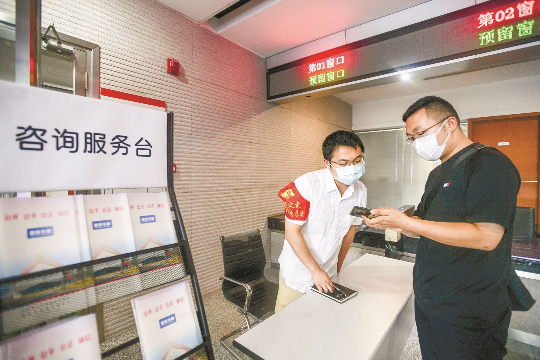 6月24日下午3時許,記者來到市民之家四樓和五樓的武漢市公共資源交易中心回訪發現,除了市民之家入口處需要掃碼測溫外,進入武漢市公共資源交易中心交易服務大廳無需二次掃碼測溫。大廳內,一名戴著紅袖標的工作人員在咨詢服務臺提供業務咨詢和引導服務。