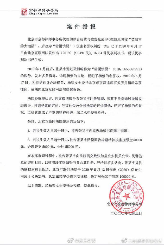 網易娛樂7月4日報道 7月3日,楊紫工作室發布名譽權糾紛案勝訴聲明。被告故意通過微博發布侮辱、誹謗楊紫的言論,侵害了楊紫的名譽權,被判決向原告楊紫書面賠禮道歉,并賠償原告楊紫精神損害撫慰金及合理開支合計55000元。工作室還表示本案所獲賠償將全數進行公益捐贈。